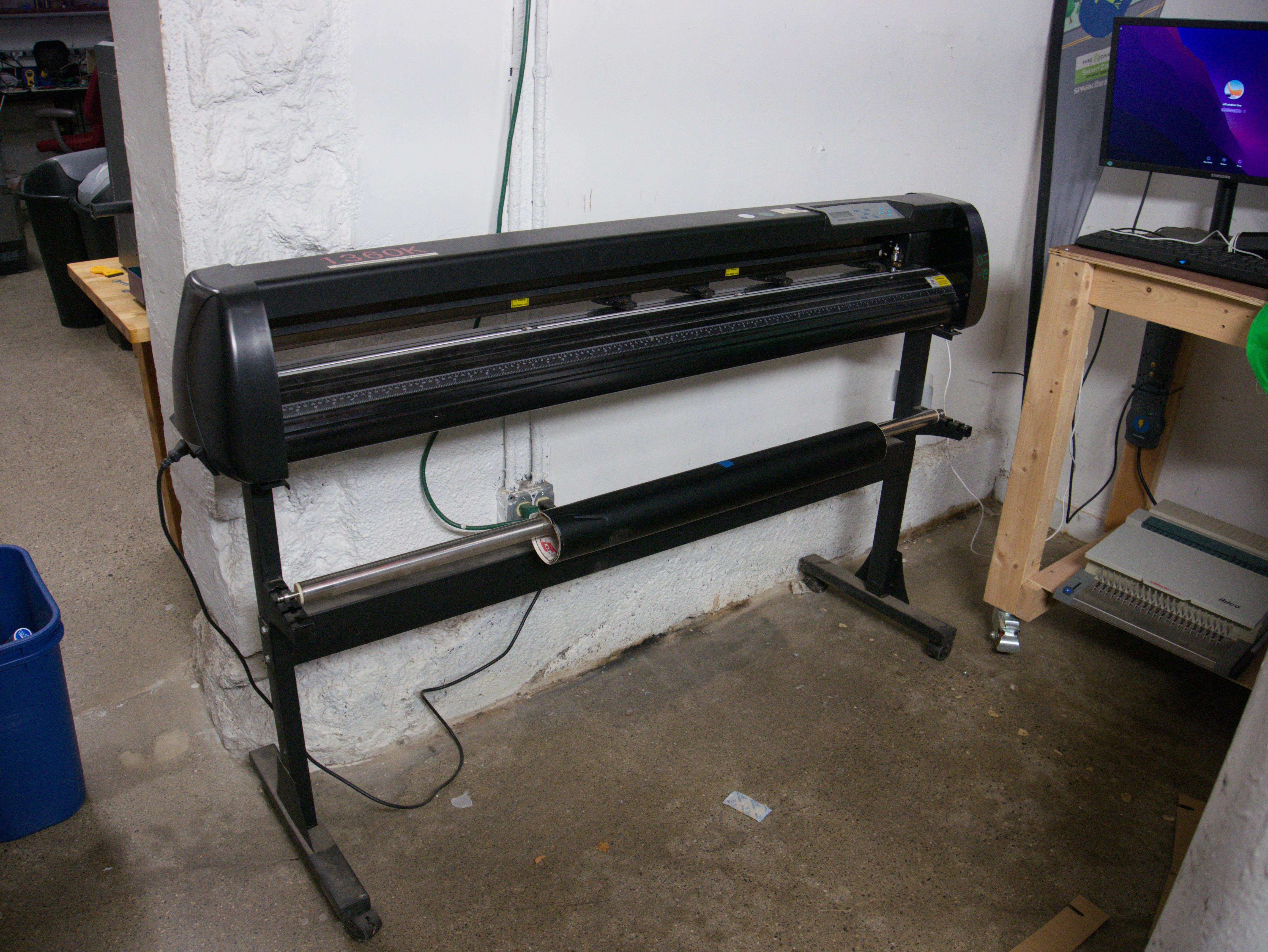 We have a 4 ft wide Rabbit 1360K vinyl cutter. You may use shop vinyl or bring your own. We do not provide transfer paper for the vinyl. The vinyl cutter is connected to a shop computer.